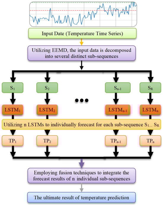 Fourth, the ensemble forecast method [17] is an approach that enhances the accuracy of temperature prediction by constructing a collection of models with different initial conditions or parameter settings, and then conducting statistical analysis on these model ensembles. This method effectively reduces the predictive errors of individual models and thereby improves the reliability and confidence of forecasts. It is commonly used for long-term and global-scale predictions [18]. In fact, methods can be diverse and mixed methods, such as Bayesian models for probabilistic temperature prediction, physical information neural networks for heat transfer modeling, and “perfect model” framework research for regional climate prediction [19].