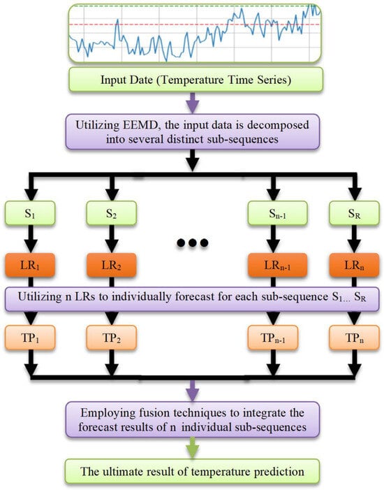 An innovative hybrid approach, EEMD-LR, is introduced for temperature time-series forecasting, integrating LR and EEMD methodologies. Initially, the EEMD algorithm decomposes the temperature time series into distinct components, each representing a simpler, more regular, and more stable sub-sequence compared to the initial series. Subsequently, the LR method is applied to forecast each sub-component signal. These predicted values are then aggregated to derive the final predictions for the initial temperature series. Two datasets were employed to evaluate the efficacy of our proposed method against nine other techniques, with our proposed method demonstrating a superior predictive performance. While our approach yielded promising results in experimentation, it also exhibited certain limitations, notably in forecasting sequences with abrupt changes.