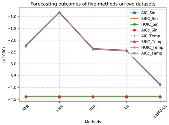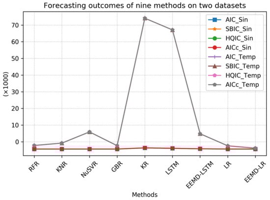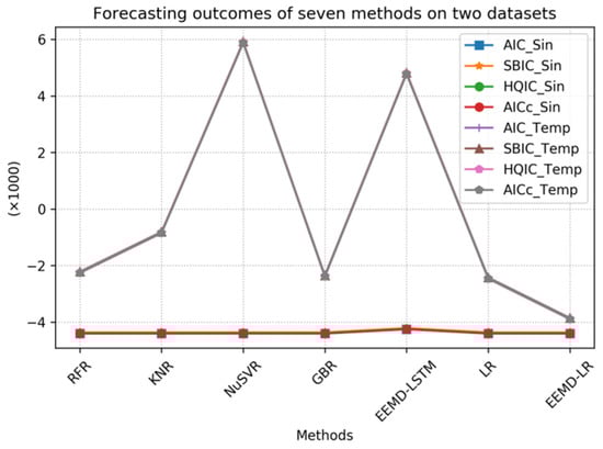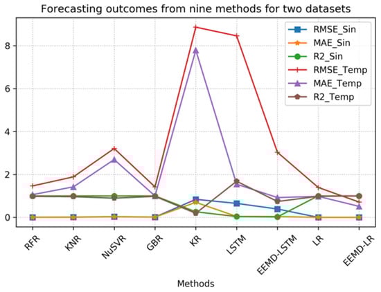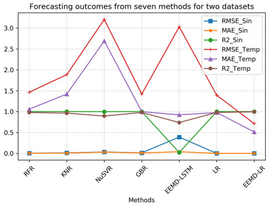Upon analyzing the experimental data in Table 3, it is evident that RFR, KNR, NuSVR, GBR, LR, and the proposed EEMD-LR method exhibit significantly high R2 index values for the temperature data, which indicates their strong forecasting capability for sine data. Additionally, these six methods demonstrate relatively low RMSE and MAE index values for the sine data, which further affirms their efficacy in forecasting sine data. Ultimately, LR and EEMD-LR outperform the others, which confirms the efficiency and accuracy of our proposed EEMD-LR method.