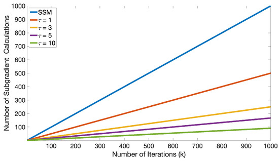 - Cyclic delay [19,20,24,26] and references therein. The typical form of this type is for all . In this case, the delays () are chosen with deterministic order from the set . This means that we will use stale information over a consistent period of length and update the new star subgradient at every iteration.