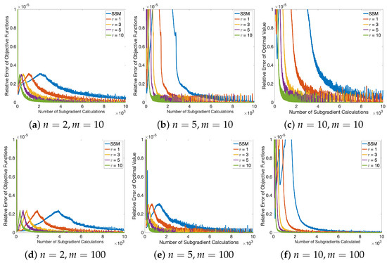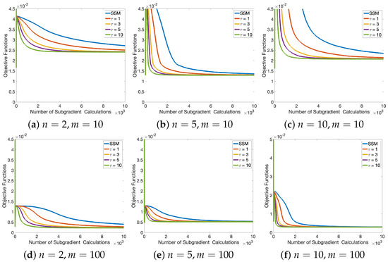 To perform the numerical experiments, we randomly set the parameter We choose the stepsize and time-varying delays to be and for all respectively. We put the initial point as the vector whose all coordinates are 1. To explain the influence of the delay bound , we perform Algorithm DSSM-I for delay bounds and 10 for various sizes of the problem n and m. Note that DSSM-I with is nothing else than the star subgradient method (SSM) proposed by Kiwiel [1]. Figure 1 illustrates the number of subgradient calculations performed by SSM and DSSM-I with the delay strategies for all .