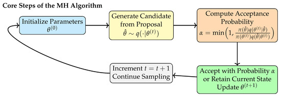 Metropolis–Hastings (MH) is one of the most representative sampling strategies in the Markov Chain Monte Carlo (MCMC) family, and it is widely used for Bayesian inference and complex parameter estimation. Its core strengths lie in a solid theoretical foundation, asymptotic convergence properties, and the ability to sample from unnormalized target distributions, making it essential when posterior distributions are intractable [1,2,3]. MH generates asymptotically exact samples by constructing symmetric or asymmetric proposal distributions and applying an acceptance probability criterion, and it has been successfully applied to high-dimensional Bayesian networks [4], nonlinear dynamical systems [5], and deep generative models [6]. Recent theoretical advances have further deepened our understanding of MH. Optimal-scaling results for general targets [7] and weak-Poincaré frameworks for pseudo-marginal MCMC [8] demonstrate its continued evolution beyond the classical formulation.