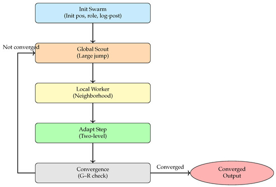 The BeeSwarm-MH algorithm introduces a role-based division of labor inspired by bee swarm intelligence, where scout bees perform global exploration while worker bees focus on local exploitation. By combining this division with the statistical consistency and acceptance rules of MH sampling, the algorithm establishes a framework that balances exploratory jumps with stable local refinement. This design enables a dynamic, adaptive balance between exploration and exploitation in high-dimensional posterior spaces, significantly enhancing the performance of classical MH methods on complex models. The overall workflow is illustrated in Figure 3, which comprises five main modules: bee swarm initialization, global exploration by scout bees, local exploitation by worker bees, adaptive step-size adjustment, and convergence diagnostics with result recording.