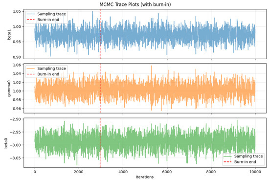 Figure 6 shows the MCMC trace plots for the parameters , , and , where the red dashed lines indicate the burn-in cutoff. It can be observed that all three chains rapidly enter a stable fluctuation region after burn-in, exhibiting no apparent systematic drift or significant trending behavior. This indicates that the Markov chains have successfully converged to the target posterior distributions and demonstrate good mixing properties. The sampling traces maintain an approximately stable mean level amidst high-frequency oscillations, further confirming adequate exploration of the parameter space and providing a reliable foundation for posterior statistical inference.