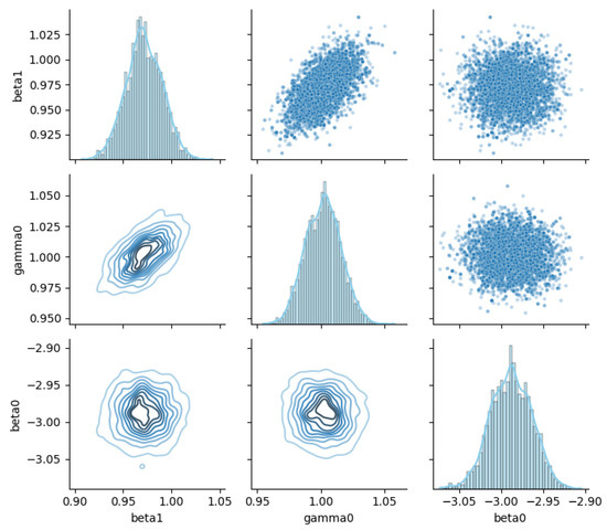 Figure 8 depicts the joint posterior relationship matrix for the parameters , , and . This figure provides a multidimensional characterization of parameter dependencies via univariate marginal distributions on the diagonal, scatter plots above the diagonal, and kernel density contour plots below the diagonal.