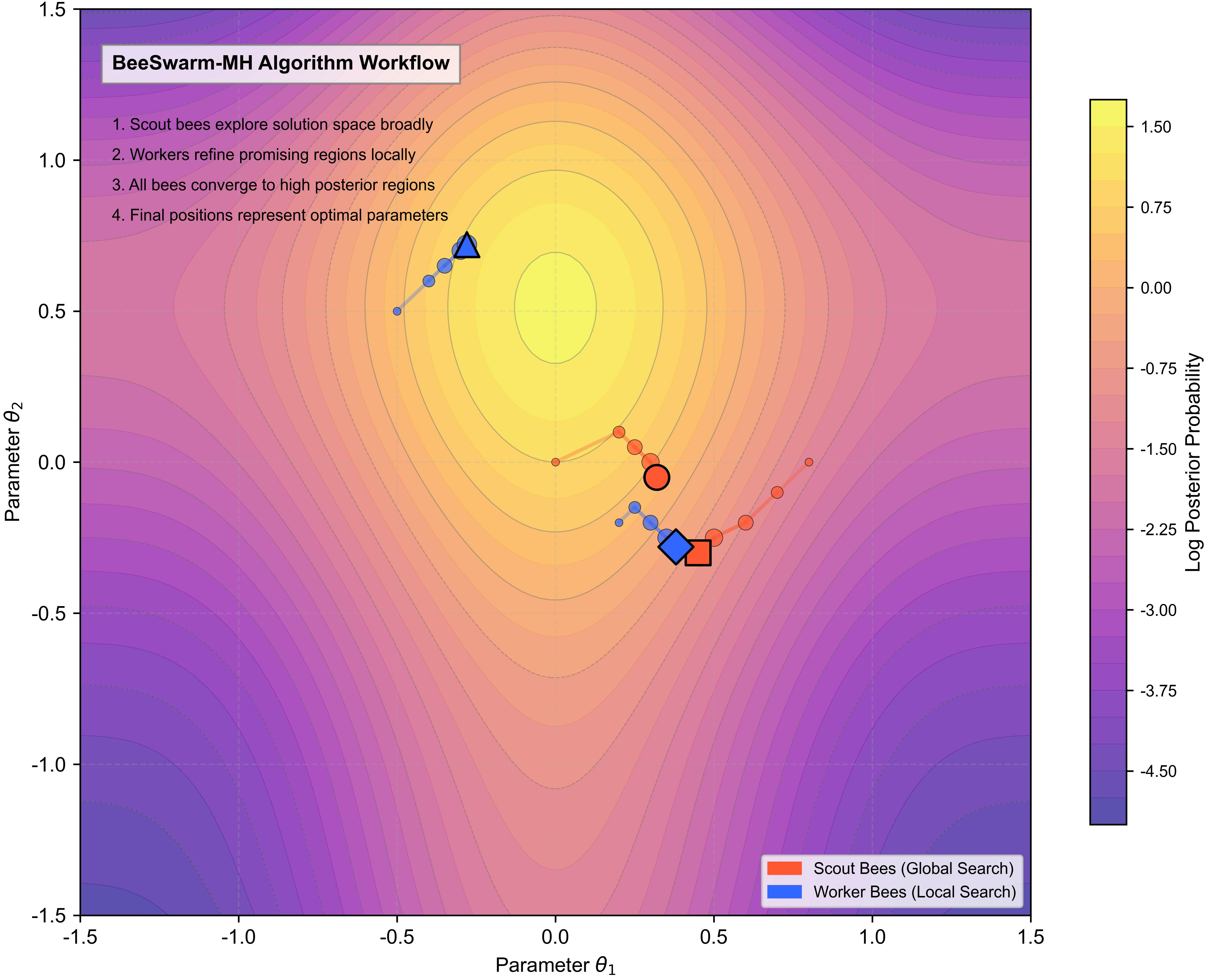 Given these limitations, incorporating bee swarm–inspired mechanisms that offer parallel search, information sharing, and dynamic adjustment capabilities has the potential to retain the theoretical strengths of MH while significantly enhancing its ability to efficiently explore complex posterior landscapes. Motivated by this, the present work proposes a hybrid sampling algorithm that integrates swarm intelligence with the MH framework, aiming to balance sampling quality with global exploration capability and to build a more robust and adaptive tool for Bayesian inference.