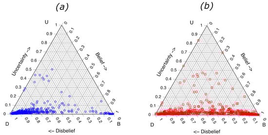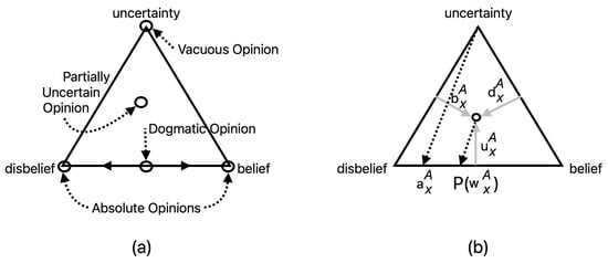 The term “opinion”, in this text, will refer specifically to a “subjective opinion”, which is composed of belief, disbelief and uncertainty masses, as well as a specified base rate [5]. The uncertainty mass can be interpreted as a degree of “I don’t know”. The belief, disbelief and uncertainty are required to sum to one, see Equation (2) below, which allows subjective opinions to be visualized on a ternary plot, as shown in Figure 1. Subjective opinions reflecting no uncertainty are “dogmatic” opinions, while dogmatic opinions expressing total belief or disbelief are “absolute” opinions.
