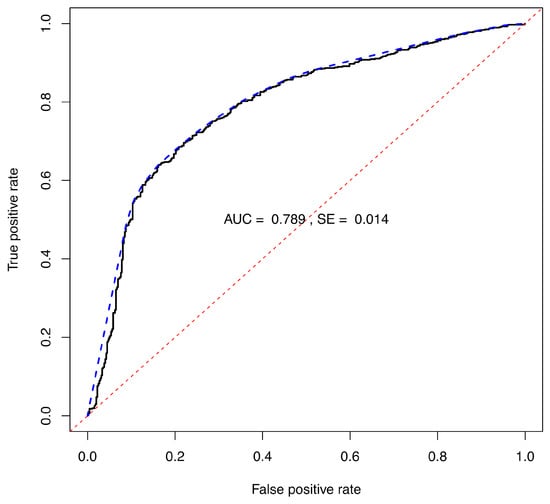 The values for the binary opinions were used to calculate scores to generate an ROC curve. The ROC curve resulting from the LDA ensemble trained on 2000 samples, including strong, moderate and weak IL contributions, is shown in Figure 3. The corresponding is 0.789, see Table 4.