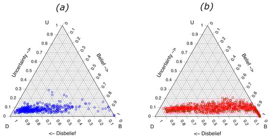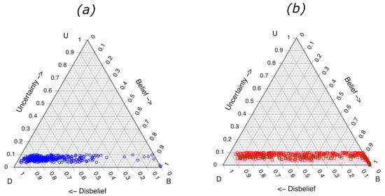 Formulating an ML subjective opinion can be accomplished by fitting predicted posterior probabilities from an ensemble of ML models to an appropriate probability distribution function. In the case of a binary opinion between two mutually exclusive states, the appropriate probability distribution is a beta distribution [5]. If the distribution of posterior probabilities for a sample is narrow the uncertainty is low, and as the width of the distribution increases, so does the uncertainty. This basic construct extends Dempster–Shaffer Evidence Theory [6]. The basis for the ensemble approach used here is briefly discussed in Section 2.5.