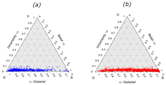 As shown in Figure 1, the visualization of binary subjective opinions is possible in a ternary plot. The calculated values for the validation samples trained on 1000 x and 1000 samples are shown in Figure 2. Figure 2a shows the values for validation samples belonging to class , and the plot Figure 2b shows the values for validation samples belonging to class x. The plots allow an immediate visual assessment of for any sample. Other general trends are observed from the ternary plots in Figure 2. The value for some of the validation samples belonging to class x are larger than some of the class . The three class x samples with the highest values all contained moderate or strong levels of the same aromatic solvent that had been weathered to 75% loss of volume, and they all contained “glue stick” as one of the substrate components. The samples correspond to reference numbers 694, 695 and 696 in the Fire Debris Database [24]. In this case, the identity and composition of the samples with the highest predicted uncertainty do not assist in understanding shortcomings in the LDA ML model, but the information could be helpful to the forensic science interpretation of model performance.