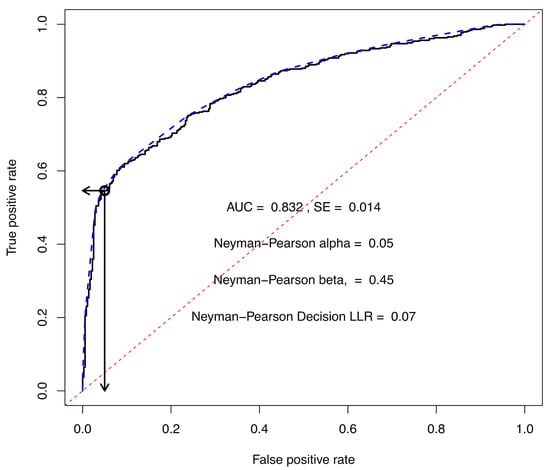 Decisions in binary cases can be made based on a decision threshold which can be plotted on the ROC curve. An optimal decision threshold score allows control over the false positive rate while simultaneously setting a true positive rate [31]. Creating an ROC curve requires the analysis of known ground truth validation samples and the creation of a “score” which is proportional to the probability that the sample belongs to the positive class [33,34]. In this work, the log-likelihood ratio (LLR), Equation (9), based on the projected opinion has been used as a score for creating an ROC curve. The higher the score, the more likely it is that the sample belongs to class x.
