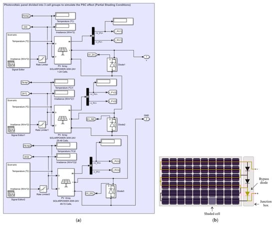 Simulink models: (a) PV system with three groups of series-connected photovoltaic cells; (b) demonstration of bypass diode operation during PSC [].