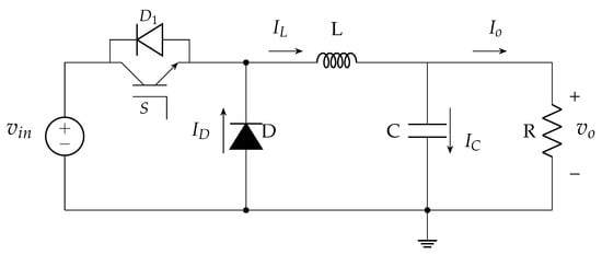 The DC/DC buck converter was carefully designed to interface with the PV panel while maintaining maximum power point tracking. The complete design process is presented below, with the circuit topology shown in Figure 4 [,].