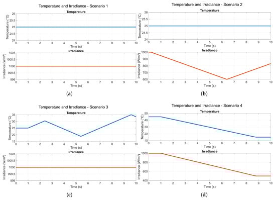 Table 4 summarizes the four scenarios for the single bypass diode configuration. These include uniform irradiance, varying irradiance, varying temperature, and simultaneous variation of both parameters, enabling assessment under static and dynamic environmental conditions. The corresponding temperature and irradiance profiles for each scenario are illustrated in Figure 5, which shows the environmental input conditions applied to the PV model in these simulations.