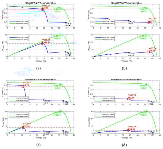 To understand the formation of multiple local maxima and the GMPP under partial shading, it is essential to analyze the I–V and P–V characteristic curves for each PSC scenario illustrated in Figure 6.