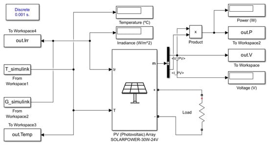 The PV system was simulated (Figure 7) using a resistive load calculated to match the maximum power point (MPP) at STC using the manufacturer specifications: