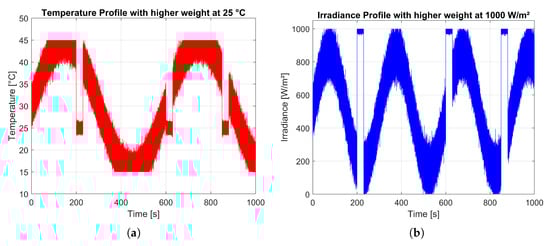 To ensure representative behavior under Standard Test Conditions (STCs), three time windows (at 200 s, 600 s, and 850 s) were defined with fixed irradiance of 1000 W/m2 and temperature of 25 °C. Outside these intervals, both irradiance and temperature followed sinusoidal functions with added Gaussian noise to emulate natural environmental fluctuations: