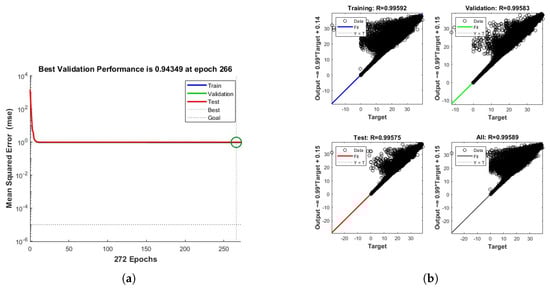 Performance of the ANN during training: (a) training performance (best validation = 0.94349 at epoch 266) and (b) training regression ( for test data).