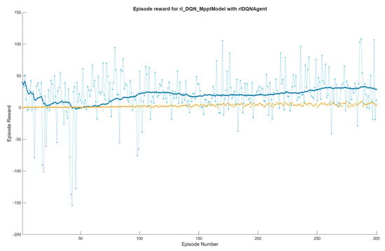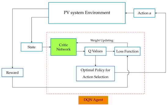 Similarly, Phan et al. [] explored DRL methods, including DQN and Deep Deterministic Policy Gradient (DDPG), for MPPT in MATLAB/Simulink simulations. Their work focused on the challenges of partial shading and showed that DQN significantly improved tracking efficiency compared to P&O. Under uniform conditions, DQN achieved a 5.83% efficiency gain, while DDPG yielded a 3.21% improvement, supporting the applicability of DRL in optimizing PV performance.