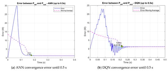 In a more recent study, Giraldo et al. [] applied Deep Reinforcement Learning (DRL), specifically a Deep Q-Network (DQN), for MPPT in real PV systems. The work includes both simulation and experimental validation, showing that, while DQN outperformed P&O in simulations, especially under partial shading conditions (PSCs), the real-world results were mixed. Notably, in PSC scenarios, P&O often got stuck in a local MPP, whereas DQN was able to extract up to 63.5% more energy, demonstrating the advantages of autonomous learning strategies. An early contribution to the use of reinforcement learning in MPPT is presented in the study by Kofinas et al. []. In their work, a tabular Q-learning algorithm was developed to track the MPP, showing strong convergence stability and reduced computational effort when compared to traditional metaheuristic techniques. Their results demonstrated that the method consistently outperformed the conventional P&O algorithm across multiple scenarios involving variations in irradiance and temperature. This line of research has since been extended by authors such as CSE [] and Bavarinos et al. [], who investigated alternative tabular reinforcement learning strategies for MPPT. These studies introduced comparative analyses between Q-learning and SARSA agents, as well as hybrid schemes incorporating fuzzy logic and sliding mode control, further validating the effectiveness of RL-based methods under dynamic environmental conditions.