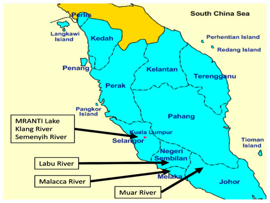 Map of Peninsular Malaysia showing the six selected study locations: MRANTI Lake, Klang River, Semenyih River (Selangor), Labu River (Negeri Sembilan), Malacca River (Melaka), and Muar River (Johor).