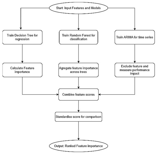Feature importance analysis assessed the contribution of each water quality parameter to the predictive model’s performance. This analysis was crucial for optimizing the hybrid model, which combined Decision Tree Regression (DTR), Autoregressive Integrated Moving Average (ARIMA), and Random Forest (RF) Classification. Figure 2 presents the step-by-step procedure.