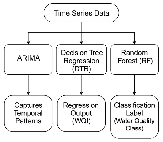 ARIMA is applied to capture linear temporal dependencies and patterns in individual parameters. Simultaneously, DTR performs regression analysis to generate continuous predictions of the WQI, while RF classifies the data into categorical water quality classes based on national standards. The outputs from DTR and RF are used in parallel to provide both detailed numerical forecasting and easily interpretable class labels, enabling a comprehensive and flexible analysis of water quality dynamics.