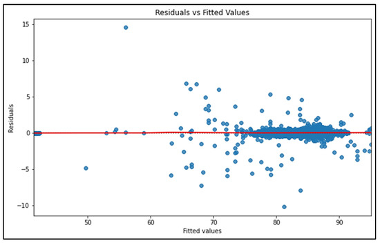 The Breusch–Pagan test is conducted to detect heteroscedasticity in residuals versus fitted values, as shown in Figure 6. The results indicate a significantly low p-value (3.138 × 10−115), well below the 0.05 threshold, and a high-test statistic (0.431), confirming substantial heteroscedasticity. The residuals exhibit a distinct trend, dispersing as fitted values increase. Additionally, several outliers deviate significantly from the zero-line, suggesting influential data points that may affect model performance. The fan-shaped residual pattern indicates non-constant variance, necessitating modifications to the target variable or model selection adjustments.
