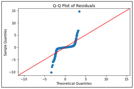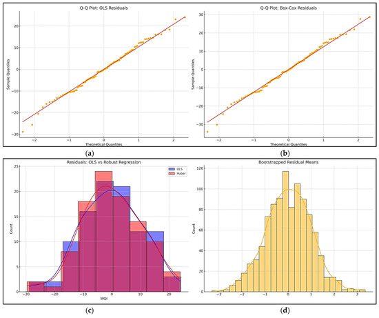 The Shapiro–Wilk test evaluates residual normality, producing a W-statistic that assesses the correlation between ordered residuals and their expected normal distribution values [43]. A Q-Q plot visualizes residual normality, where a straight diagonal line confirms normality, and deviations suggest non-normality. In response to potential assumption violations, additional remedial strategies are implemented to evaluate and improve model robustness. A logarithmic transformation and Box-Cox transformation are applied to the dependent variable to stabilize variance and improve residual normality. The Box-Cox method determines the optimal transformation parameter (λ), with values close to 1 indicating minimal need for transformation. In parallel, a robust regression model using the Huber loss function is applied to mitigate the influence of outliers and non-constant variance. To complement these parametric adjustments, residual bootstrapping is performed, generating resampled distributions of residual means to evaluate model stability without relying on strict normality assumptions. These diagnostic and corrective procedures are conducted in anticipation of assumption violations and are further supported by visualizations in Section 4. These tests ensure that violations are detected and mitigated to enhance model reliability.