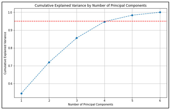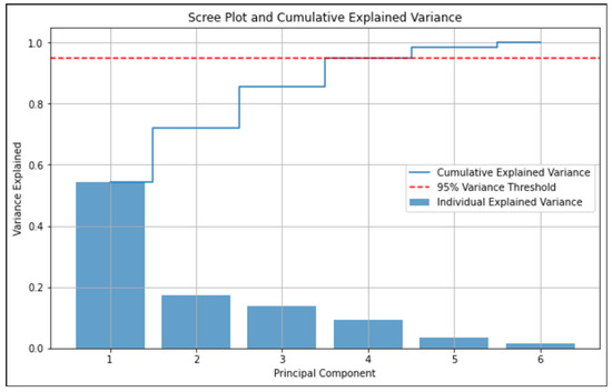The convergence of the cumulative variance line with the 95% threshold indicates an ideal quantity of principal components for effectively capturing the data while minimizing redundancy and overfitting. Beyond this threshold, further components are inadequately justified as they contribute insignificantly to elucidate the overall variance [51]. This graph clearly demonstrates the efficacy of PCA in diminishing the dataset’s dimensionality. It offers a visual rationale for choosing a particular number of components to achieve a balance between complexity and information loss.