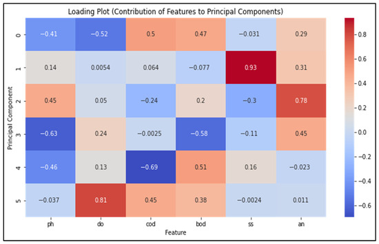 The relationship between the number of principal components and the cumulative explained variance is shown in Figure 12. The cumulative explained variance increases rapidly for the first four principal components, indicating that these components capture a significant portion of the variability in the dataset. This dataset comprises six water quality parameters: pH, DO, COD, BOD, TSS, and AN. However, PCA analysis reveals that not all parameters contribute equally to the total variance. The first four components capture most of the information, while the fifth and sixth component contribute negligibly to the cumulative variance. This is why the number of primary components needed to explain 95% of the variance is four rather than six. The horizontal dashed red line at 95% cumulative variance demonstrates that the first four components sufficiently represent the dataset, ensuring dimensionality reduction without significant information loss.