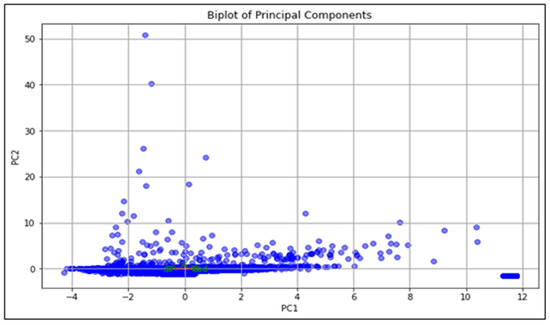 The scatterplot depicted in Figure 15 illustrates the data distribution inside the space specified by the initial two main components obtained by PCA. Most of the data points are densely grouped near the horizontal axis around zero on both the PC1 and PC2 axes. This clustering indicates that most of the data variability is accounted for by these two components, and numerous observations exhibit comparable scores on these components. Numerous data points have substantial positive or negative scores along the PC1 and PC2 axes. These outliers are distanced from the central cluster, signifying observations having typical properties relative to most of the data. The horizontal line around zero for PC2, with the most of data points clustered around it, indicates that PC2 contributes less to data variation than PC1, which exhibits a wider dispersion.