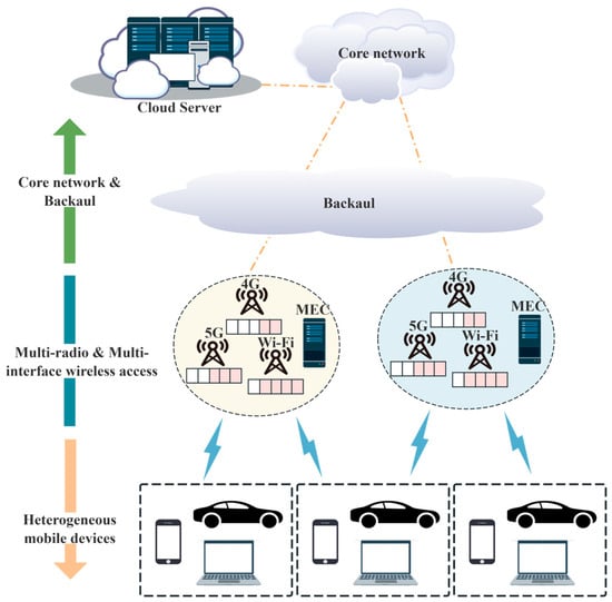 The proposed system architecture, as shown in Figure 1, comprises a hierarchical network structure integrating a core network, backhaul links, multi-radio access points with embedded MEC capabilities, and heterogeneous mobile devices equipped with multiple wireless access links, including 4G, 5G and Wi-Fi [1]. In this framework, mobile devices leverage edge computing resources for both data processing and storage while generating substantial uplink/downlink traffic flows.