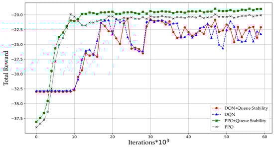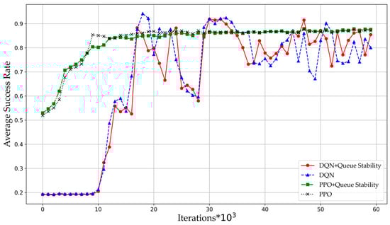 Figure 3 compares the total reward of the DQN and PPO algorithms. As the number of iterations increases, the cumulative reward value of the PPO algorithm gradually rises and stabilizes, while the DQN algorithm shows increasing reward values but with lower stability compared to the PPO. The PPO algorithm achieves higher reward values, indicating its superior performance in metrics including transmission success rate, average delay, and average queue length. The fundamental reason lies in their methodological differences in two algorithms. The DQN algorithm discretizes the action space and can only explore coarse-grained actions. The PPO algorithm is able to obtain optimal policy by exploring fine-grained action space. For the DQN algorithm, the optimal action may lie outside the discrete action space. Due to this algorithmic characteristic, the cumulative reward achieved by DQN is lower than that of PPO.