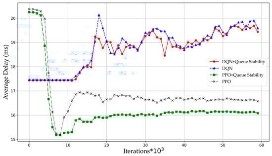 Figure 6 presents the evolution of average queue lengths for different algorithms during experiments. The incorporation of queue stability constraints directs the agent to monitor traffic intensity across transmission queues. By integrating traffic intensity metrics with other state indicators, the agent makes balanced decisions through the reward function to maximize expected returns. Consequently, algorithms with queue stability constraints—both DQN-QS and PPO-QS—consistently maintain shorter average queue lengths than their baseline counterparts. This improvement is further reflected in reduced average packet delays, and ultimately lower end-to-end latency.
