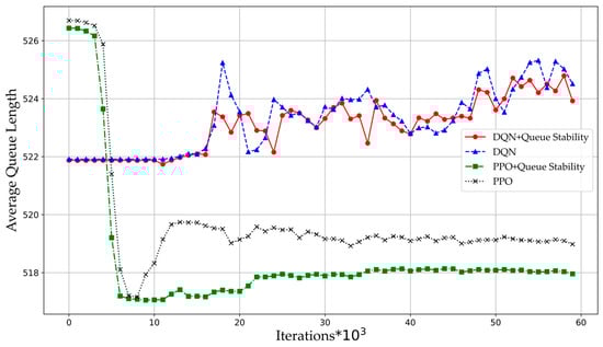 Average queue length between the DQN and PPO algorithms.