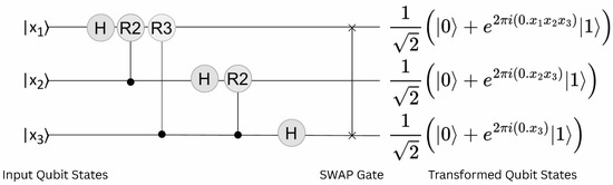 This definition scales naturally to any number of qubits n, where each entry of is computed using the matrix defined in Equation (10). The QFT matrix acts on the quantum state vector, converting it from its original time-based representation into the frequency domain by multiplying the state vector by . For an example, consider the four basis vectors representing two-qubit states: , , , and . Applying the transform to each input yields distinct vectors in the frequency domain, as shown in Equations (13) through (16).