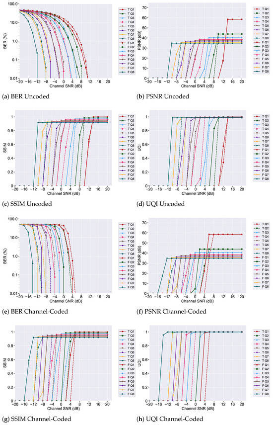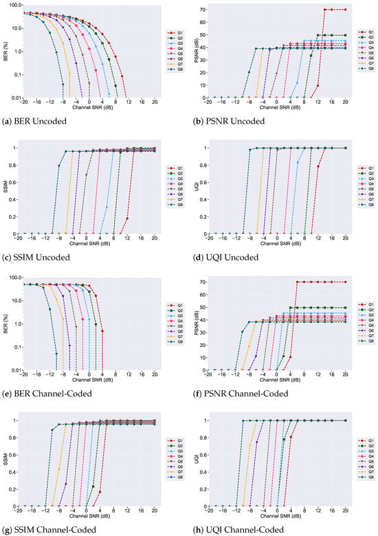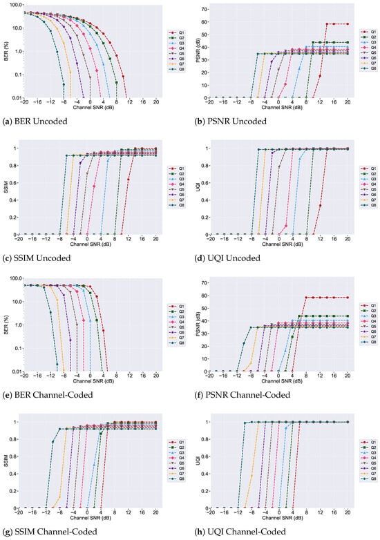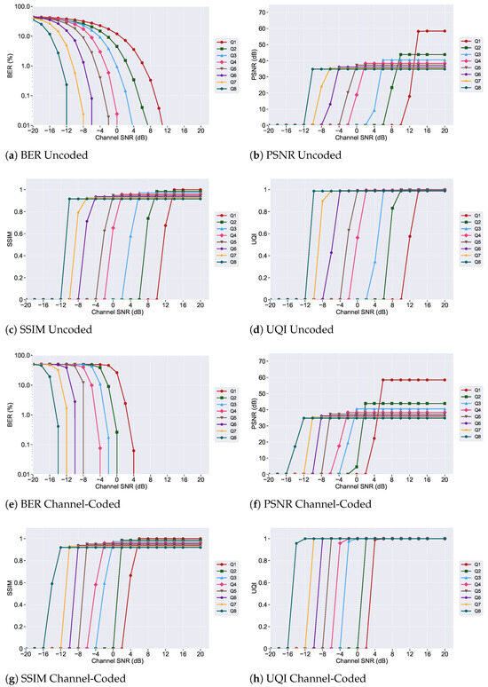 Comparison of encoding complexity and error resilience (based on BER at an SNR of dB) for JPEG uncoded images across time domain and frequency domain systems (Q1–Q8).