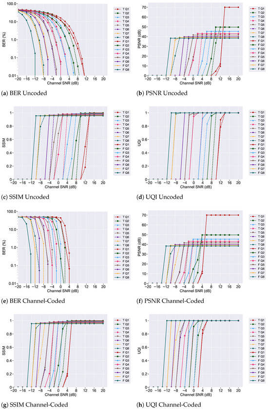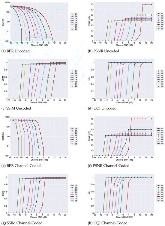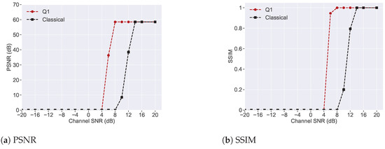 In addition, the analysis of frequency domain and multi-qubit systems indicates that increasing the qubit encoding size from Q1 to Q8 significantly increases system complexity, mainly due to the greater number of quantum gate operations required for both encoding and decoding. As the number of qubits increases, the dimensionality of the Hilbert space expands exponentially, resulting in more intricate superposition states and a greater computational burden on the quantum circuit. Although the Q1 system offers the lowest complexity with minimal quantum gate requirements, it also provides the least resilience to transmission errors. In contrast, the Q8 system delivers the highest error resilience, but at the cost of substantially increased quantum processing complexity. This illustrates a clear trade-off: higher qubit encoding sizes improve robustness and image quality, but they also demand more computational resources and introduce greater system overhead. Ultimately, the choice of encoding size depends on the desired balance between performance and implementation complexity, with Q1 being suitable for low-complexity scenarios with low noise and Q8 ideal for high-fidelity transmission in high-noise environments with more capable quantum architectures.