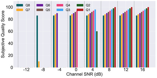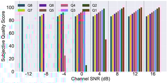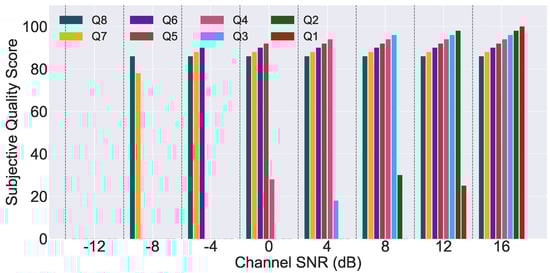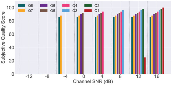 Subjective quality assessment results for JPEG image transmission using time domain multi-qubit systems under channel-coded conditions.