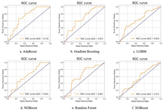 The AUC value for each algorithm was greater than 0.5, which indicates that the algorithms can be used for prediction. The highest AUC values were achieved by the AdaBoost (0.73) and gradient boosting (0.67) algorithms, and the lowest, by the XGBoost algorithm (0.57). The remaining algorithms yielded values in the range of 0.62–0.63.