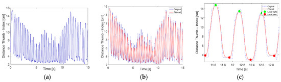 Thumb–index distance measured during FT task: (a) raw data, (b) Gaussian smoothed data, and (c) zoomed-in with local maxima (green dots) and minima (red dots).