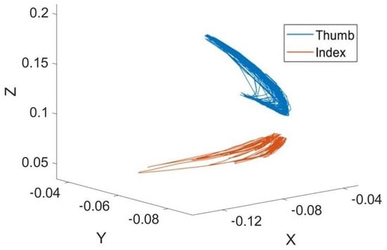 The three-dimensional trajectory of thumb and index finger movement during the FT task.