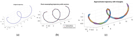 (a) A 3D trajectory, (b) the trajectory resampled with equidistant points connected by 3D vectors, and (c) the trajectory divided into triangles.