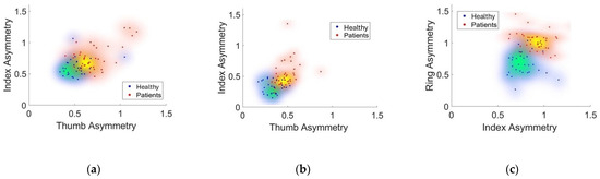 In general, given that PD commonly manifests with asymmetric motor signs [47], to account for asymmetries (if any) between hands, a further feature, asym, was calculated as the ratio between the homogeneous features of the two hands for both the PD and HC groups to account for differences.