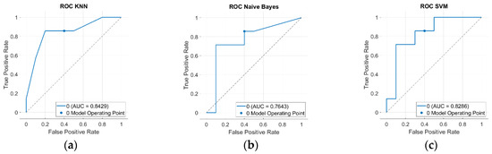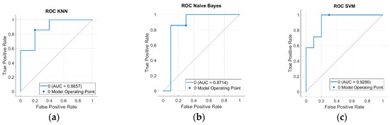 The ROC curves of the (a) KNN, (b) Naive Bayes, and (c) SVM classifiers fed with a combination of classical and geometric features. The AUC value is reported in the bottom right corner of each image.