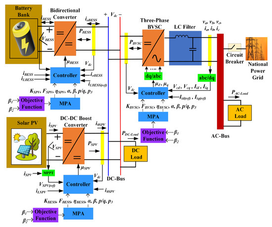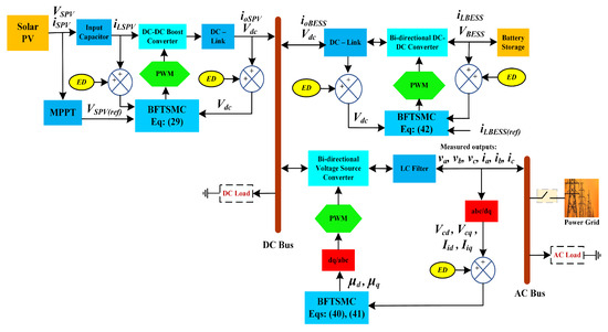 The DC sub-grid is the primary domain for integrating renewable energy and BESS. A solar PV system is connected through a DC–DC boost converter (DBC) to a 640 V DC-bus, where maximum power point tracking is employed to ensure optimal energy harvesting. A BESS is connected via a bidirectional DC-DC converter (BDC), allowing for both charging and discharging operations. These operations are managed based on the battery’s state of charge (SoC), contributing to improved energy balance and battery longevity. DC loads are supplied directly from the DC-bus, enhancing efficiency by minimizing conversion stages. The AC sub-grid operates at 220 V RMS and is interfaced with the DC sub-grid through a three-phase bidirectional voltage source converter (BVSC). This converter plays a crucial role in facilitating bidirectional energy flow, maintaining voltage and frequency stability, and managing AC-side power quality. It also interfaces with LC filters to smooth current and voltage waveforms, and connects to the AC bus through a circuit breaker, allowing connection to the national grid and AC loads. The system supports both grid-tied and islanded modes, enabling operational flexibility.