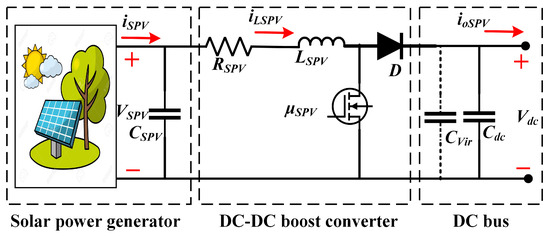 The solar PV system is connected to the 640 V DC-bus through a DBC, which operates under MPPT and voltage regulation control. The equivalent electrical model is shown in Figure 2, and the corresponding state–space equations are given by