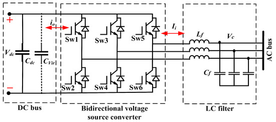 The BVSC plays a pivotal role in coordinating power exchange between AC and DC subgrids. Its stability is crucial, especially under bidirectional operation. Incorporating a virtual capacitor helps stabilize the shared DC-bus voltage during switching and load fluctuations, as illustrated in Figure 3. Considering both the influence of virtual capacitance and exogenous disturbances, the enhanced dynamic model of the BVSC with an output LC filter and a virtual capacitor becomes