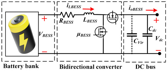 The BESS is connected to the DC-bus via a BDC, allowing it to charge/discharge based on system requirements and SoC limits. The equivalent circuit is depicted in Figure 4, and its dynamical behavior is governed by